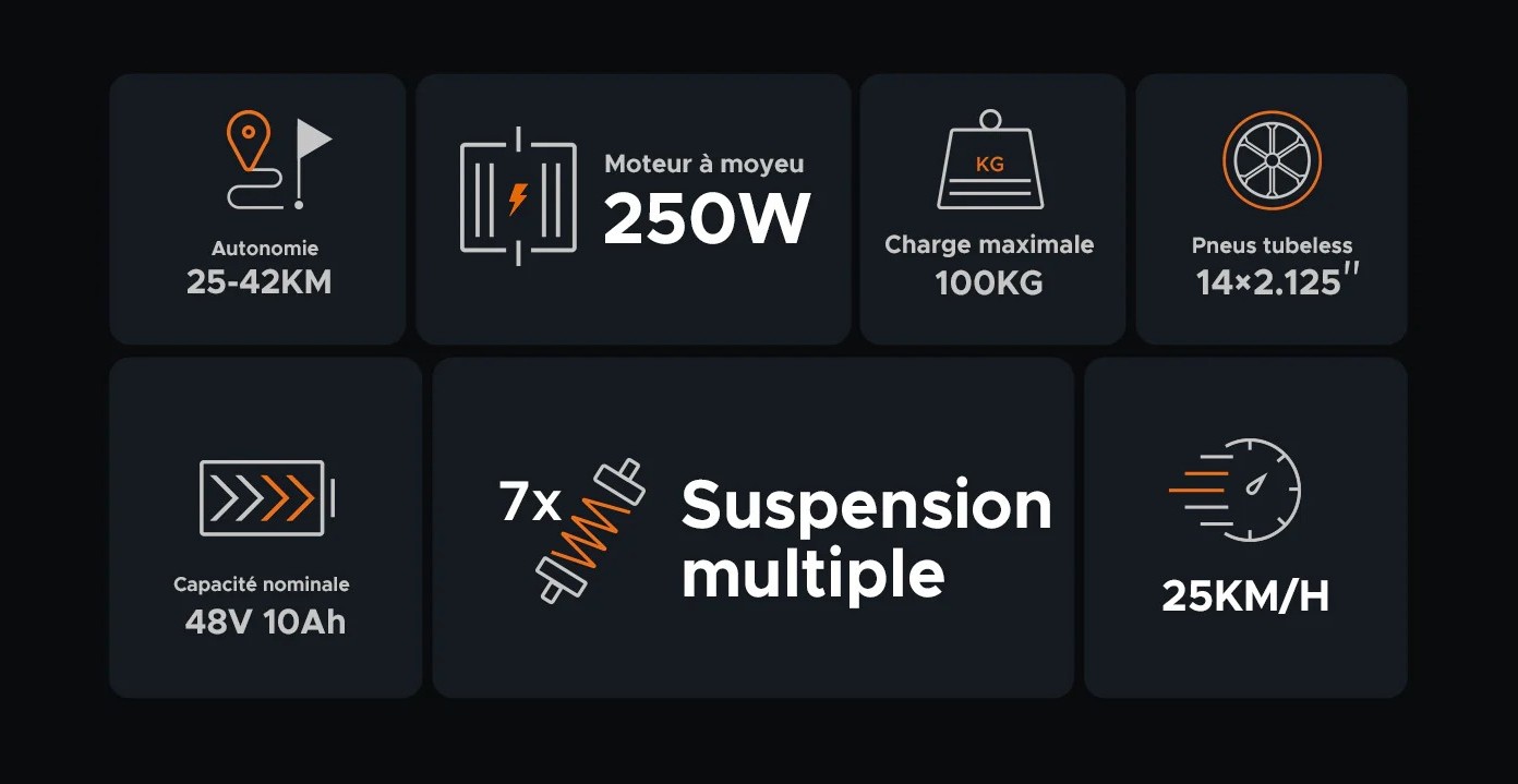 | Autonomie | 25 km (mode électrique) / 42 km (mode assistance PAS) |
