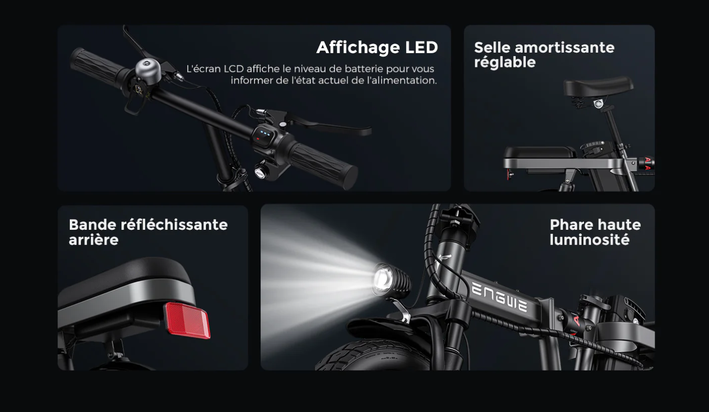 Que vous soyez étudiant, travailleur ou amateur de balades pratiques, le ENGWE T14 vous séduira par sa maniabilité et sa polyvalence. Pliable en quelques secondes, il combine praticité et innovation pour transformer chaque déplacement en expérience agréable.